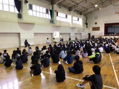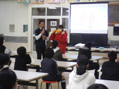 マイナス40度の世界での実験「シャボン玉をしたらどうなるか」「熱湯を空中に撒くとどうなるか」等、映像を交えてお話ししてくださいました。防寒着の体験などもありあっという間の時間でした。最後に「人生は一度しかない。悔いのない生活をしてほしい。」と語り、授業を締めくくりました。